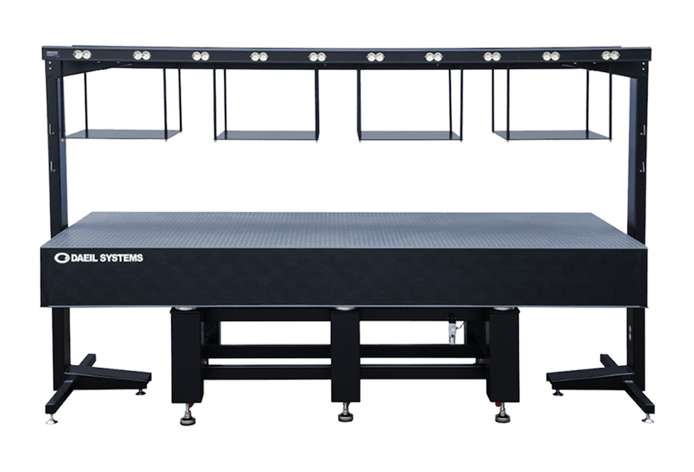 Overhead Shelf System.Overhead Optical Table Shelf Systems streamline lab space, supporting power supplies, controllers, oscilloscopes, and more. Dual-sided top outlets offer easy access to power, while adjustable shelves provide flexible, efficient organization.