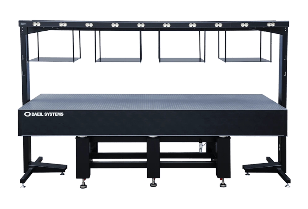 Overhead Shelf System.Overhead Optical Table Shelf Systems streamline lab space, supporting power supplies, controllers, oscilloscopes, and more. Dual-sided top outlets offer easy access to power, while adjustable shelves provide flexible, efficient organization.