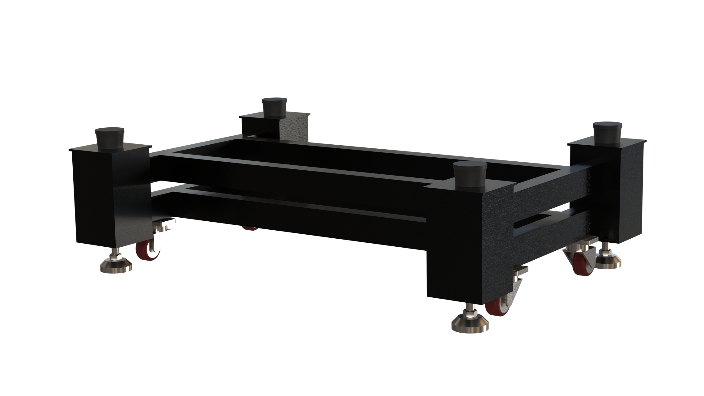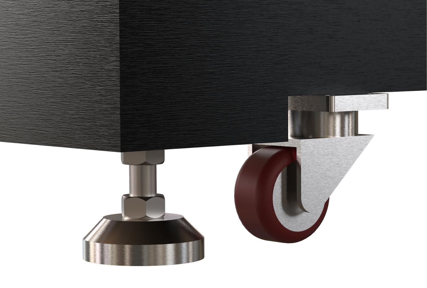 The tie-bar frame integrates industrial swivel casters directly beneath the support, so the system rolls as a single unit when you need to reposition the table. Once in place, you simply extend the leveling feet with wide floor pads to transfer the load from the wheels to the ground. The casters lift clear, the frame becomes rigidly supported, and the table is anchored in minutes. You get quick layout flexibility without leaving the system on compliant wheels during operation.