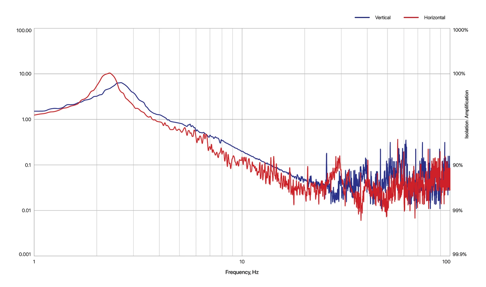 The system utilizes advanced pneumatic isolators to deliver industry-leading stability. It achieves a low resonant frequency of 1.5 Hz – 3.0 Hz and effectively eliminates 80% – 90% of floor vibrations at 10 Hz, ensuring uncompromised precision for sensitive microscopy and optical applications.